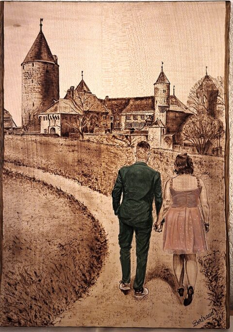 Pour mon septième anniversaire, j’ai reçu un pyrograveur simple avec lequel j’ai commencé à réaliser de petits cadeaux pour ma famille. Avec le temps, mon envie de progresser m’a conduit à investir dans un appareil plus performant, doté d’un transformateur 220 volts et d’un réglage précis de température, offrant une meilleure maîtrise des ombrages et de la qualité du trait. Les embouts interchangeables me permettent aujourd’hui de varier la finesse et la profondeur du tracé. Autodidacte, j’ai pu développer mon style et aborder une grande diversité de sujets.
